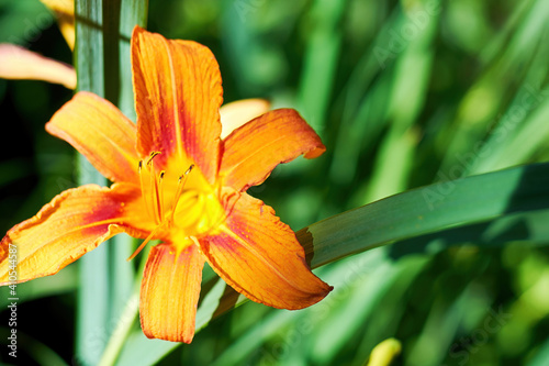 Lush spring lily in the green grass lawn. Floral and herbal backgrounds.