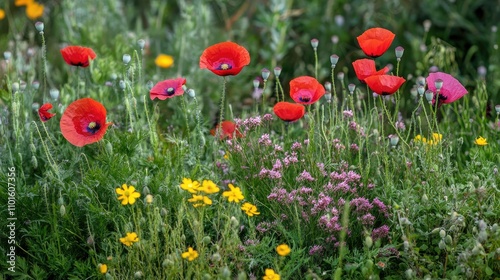 Lush summer meadow featuring a colorful array of blooming red poppies alongside vibrant purple and yellow wildflowers.