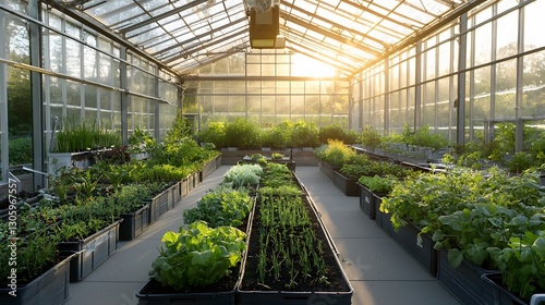 Lush thriving organic vegetable garden cultivated inside a warm inviting greenhouse with golden sunlight filtering through the glass panels