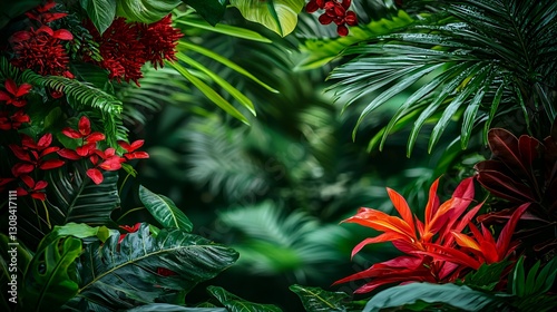 tropical, leaf, plant, green, red, jungle, foliage, nature, background, lush, vibrant, exotic, flora, vegetation, rainforest, red flower, green leaf, dark green, bright red, natural background, tropical rainforest, botanical, flora, leafy, lush green, garden, plant, summer, warm, humid, alive, wet, living