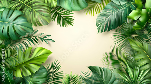 Lush tropical leaves frame a creamy beige background, ideal for text or product placement. Perfect for summer designs, travel brochures, or wellness themes.