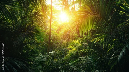Lush Tropical Rainforest Jungle Sunlight Streaming Through Palm Trees