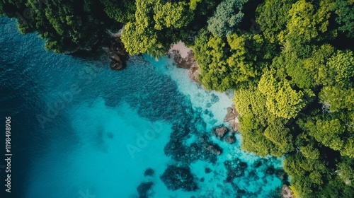 tropical, rainforest, ocean, beach, turquoise, aerial, view, lush, green, secluded, coastline, nature, landscape, island, exotic, paradise, summer, vacation, travel, holiday, serenity, calm, calmness, water, shore, coral, reef, sky, drone, photo