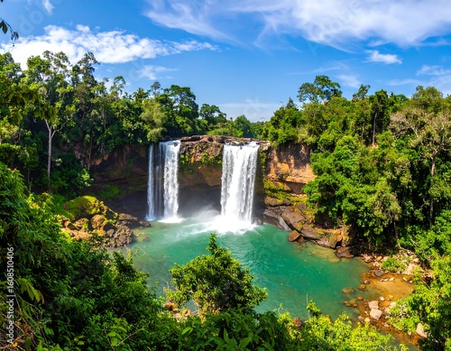 waterfall, tropical, rainforest, lush, greenery, cascading, turquoise, pool, scenic, nature, landscape, vibrant, cloud, sky, water, tree, jungle, forest, view, vista, travel, adventure, vacation, beauty, fresh, powerful, amazing, breathtaking, environment, rock, stone, green, blue, natural, river