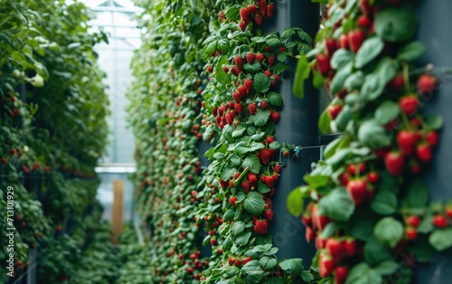 Lush Vertical Strawberry Garden in a Greenhouse During Daytime