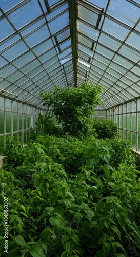Lush vibrant green foliage thriving inside a contemporary glass greenhouse structure, emphasizing growth and environmental control ,serene ,glass structure ,plants