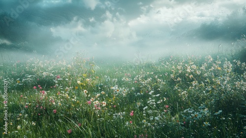 Lush Wildflower Meadow with Misty Clouds Under Dramatic Sky