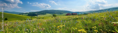 lush, wildflower, meadow, rolling, hill, distant, rural, farmhouse, environment, pastoral, bliss, copy, space, text, sharpened, cover, all, object, deep, filed