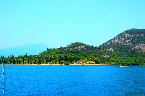 paradise, idylli, recreation, relax, holiday, vacation, house, building, crag, cliff, rocky, mountainous, mountain, hill, olive, cypress, forest, tree, vegetation, green, sailing, boat, cloudless, sky, shoreline, shore, ripple, water, blue, lakeshore, landscape, scenery, picturesque, colourful, panorama, view, sunny, summer, nature, beautiful, cruise, tour tourism, trip, travel, garda, lake, italy