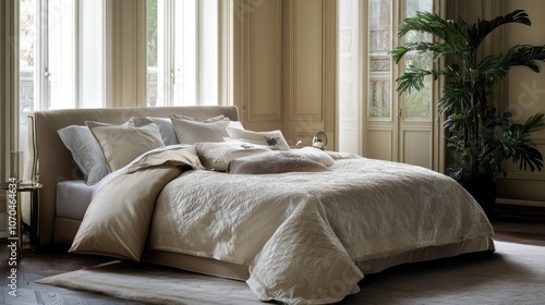 Luxurious bed with layered bedding in neutral tones. Copy space