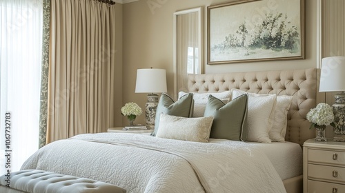 indoor, furniture, minimalist, rug, simplicity, no people, room, estate, three-dimensional, elegant, elegance, contemporary, idea, floor, flooring, cosy, lighting, apartment, bedchamber, interior, design, decor, bed, headboard, tufted, pillow, white, bedding, blanket, comforter, curtain, drape, window, light, lamp, shade, floral, artwork, painting, frame, vase, flower, hydrangea, nightstand, drawer, beige