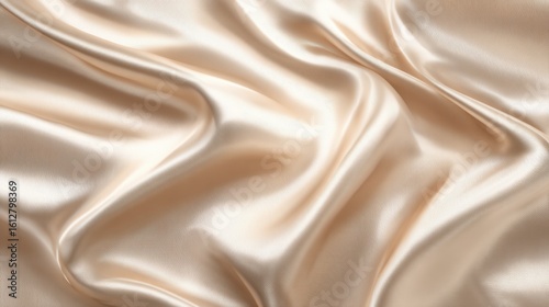 Luxurious beige satin fabric drapes softly, displaying gentle waves and a smooth texture. The fabric reflects light subtly, enhancing its elegant appearance and richness.