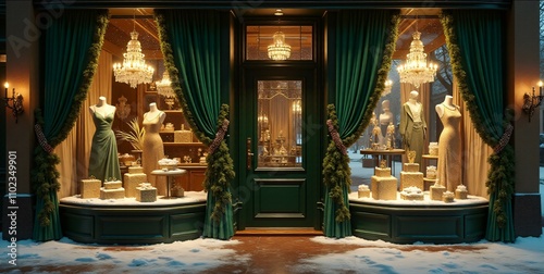 Luxurious boutique with elegant dresses, golden showcases, green curtains, and snowy trees. A sophisticated ambiance with winter views and unique festive details.