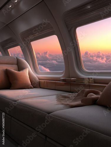 Luxurious business class cabin sunset sky comfortable sofa soft pillow blanket peaceful atmosphere travel relaxation