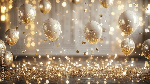 luxurious celebration scene with elegant backdrop, balloons of various sizes, shimmering golden confetti scattered across the floor and some floating in the air to add a festive atmosphere