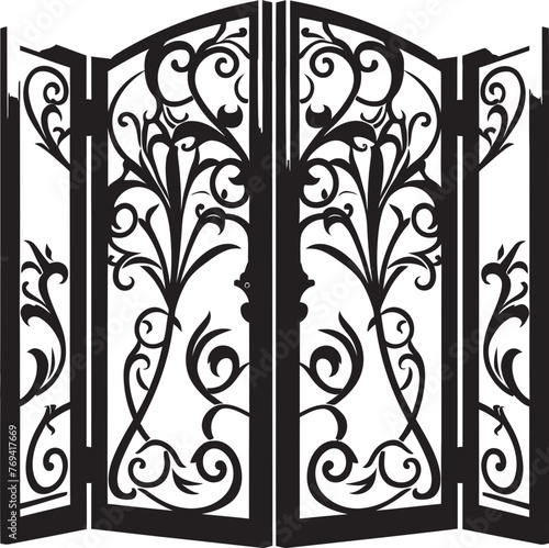 Luxurious Garden Passage Wrought Iron Bi Fold Door, Black Vector Emblem Refined Elegance Wrought Iron Bi Fold Garden Door, Black Logo Design