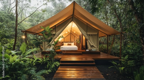 luxurious glamping tent in a lush forest. The elegant tent features a cozy interior and wooden deck, perfect for a serene escape.