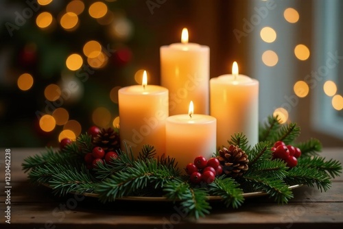 Luxurious gold candle arrangement with pine branches and berries, festive decor, fairy lights, winter wonderland