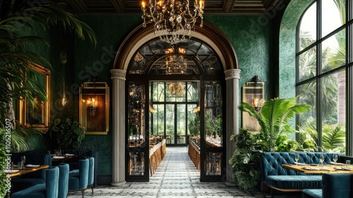 eatery, interior, luxury, green, arch, doorway, seating, plush, velvet, window, large, plant, tropical, foliage, chandelier, elegant, opulent, dining, room, space, design, decor, style, modern, classic, vintage, sophisticated, affluent, wealthy, grand, majestic, ornate, detail, pattern, floor, tile, table, chair, light, bright, dark, shadow, beauty, atmosphere, ambience, exquisite, rich