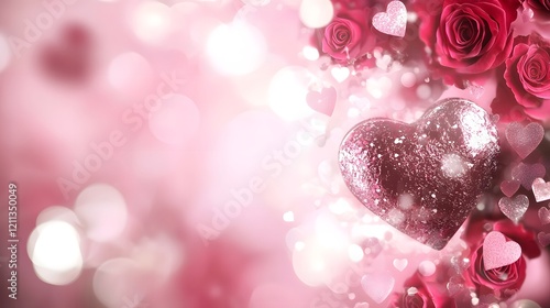 Luxurious heart shaped chocolate box adorned with fresh red roses set on a soft pastel pink background creating a romantic and indulgent scene perfect for celebrating Valentine s Day