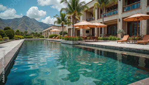 hotel, luxury, swimming pool, tour tourism, landscape, tropical, vacation, architecture, relaxation, resort, palm tree, mountain, travel, elegance, scenery, leisure, picturesque, amenity, sunlight, comfort, hospitality, design, inviting, retreat, beauty, exotic, wellness, paradise, destination, serene, calmness, life events, ambience, vibrant, upscale, get-away, nature, peaceful, idylli