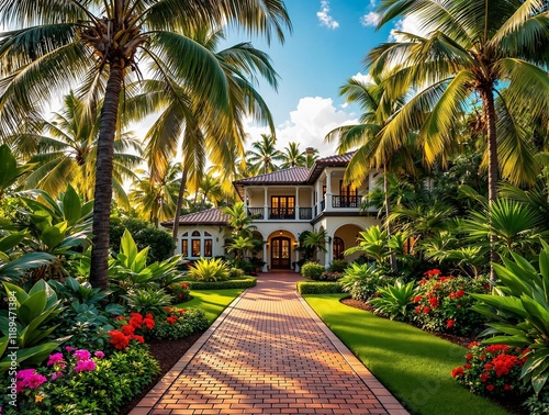 luxurious house surrounded by lush greenery, with a brick pathway leading up to the entrance. The house is adorned with palm trees, vibrant flowers, and a clear blue sky above.