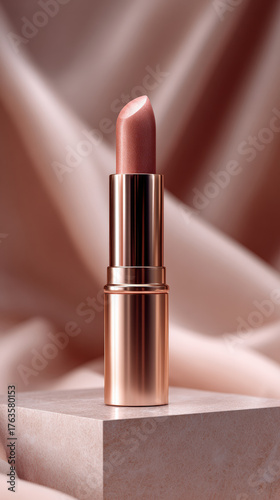 Luxurious lipstick with sleek design, resting on soft, elegant surface. warm tones and smooth texture evoke sense of sophistication and beauty