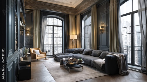living room, curtain, window, luxury, modern, elegant, interior design, home decor, furniture, grey, beige, floor lamp, coffee table, pillow, armchair, wooden floor, stylish, sophisticated, high-end, residential, apartment, house