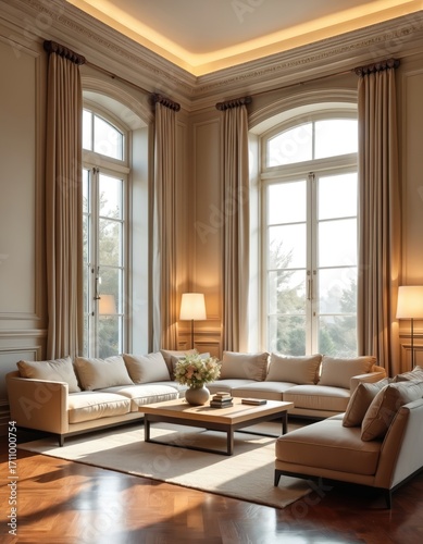 Luxurious living room with sectional sofa, coffee table with books and flowers. Large windows with beige curtains, warm ambient lighting from ceiling and lamps. Elegant home interior.