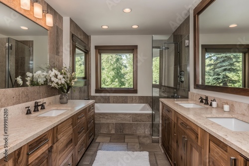 bathroom, luxurious, modern, vanity, double, sink, countertop, stone, cabinet, wood, brown, faucet, fixture, shower, glasses, bathtub, tile, flooring, natural, light, window, tree, mirror, decor, elegant, roomy, design, renovated, home, interior, clean, stylish, tranquil, serene, comfort, relaxing, spa, amenity, residential, architecture, bright, white, beige