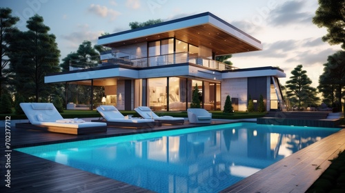 Luxurious modern house with pool, lounge chairs, and tranquil natural surroundings.
