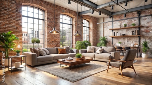 Luxurious Modern Minimalist Industrial Chic Exposed Brick Accent Wall Neutral Color Scheme Soothing Ambiance High Ceiling Open Concept Living Room