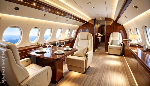 private, jet, interior, luxury, roomy, elegant, cabin, dining, seating, modern, comfortable, wooden, light, window, view, cream, beige, brown, furnishing, table, chair, glassware, plate, lamp, design, high-end, aircraft, travel, comfy