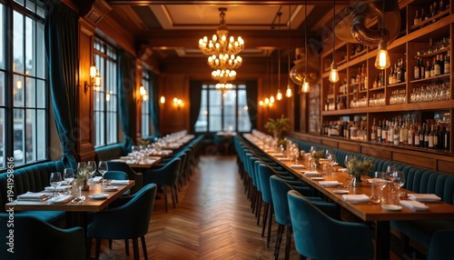 Luxurious restaurant interior with tables set for dining. Booth seating, wood paneling, chandeliers, and wine shelves create an upscale atmosphere. Guests can enjoy fine dining and drinks.