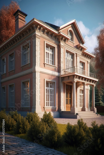 Luxurious Russian-style private house with a stately brick facade, elegant columns, and intricate architectural details, bathed in warm sunlight and surrounded by lush greenery.