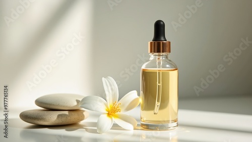 serum, moisturise, luxurious, glass bottle, white flower, smooth stone, minimalist, skincare, beauty product, cosmetic, wellness, elegant, health care, pampering, glow, clean, fresh, spa, aromatherapy, relaxation, zen, topview, decorative, well-being