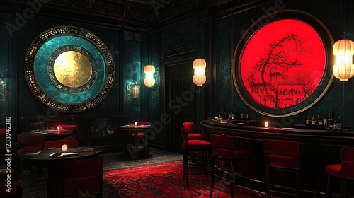 Luxurious Speakeasy Bar Interior, Red Lighting, Asian Decor, Night