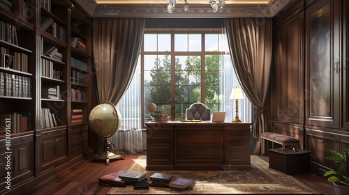 library, bookshelf, bookshelf, book, globe, desk, chair, laptop, window, curtain, rug, lamp, wooden floor, interior design, home office, luxury, elegant, classic, traditional, vintage, cosy, comfortable, warm, inviting, reading, working, learning, cognition, education, business, success, workplace, office, furniture, decoration, home decor, house, room, space, architecture, interior, design, style, modern, contemporary, beautiful