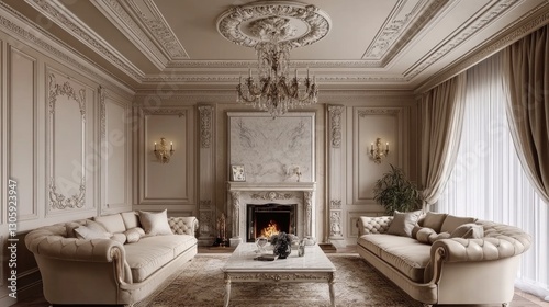 Luxurious traditional living room with ornate ceiling molding, a marble fireplace, and plush seating in neutral tones