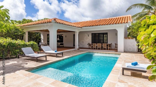 Luxurious tropical villa with private pool, sun loungers, and lush greenery under a bright blue sky
