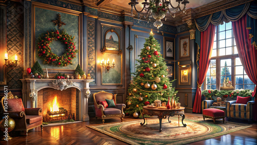 Luxurious Victorian living room with a grand Christmas tree, garlands, wreaths, and a glowing fireplace, set in rich blue and gold tones