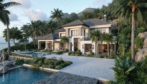 Luxurious villa rests on cliffside overlooking blue ocean. Infinity pool glistens in tropical gardens. Modern architecture, pebble driveway leads to elegant estate perfect for vacation resort living.