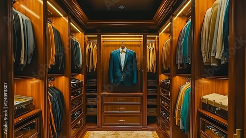 Luxurious walk-in closet, suits, shirts, interior design, elegant