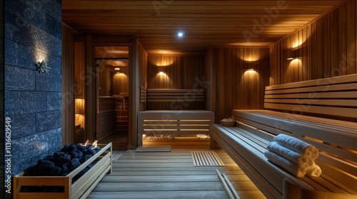 luxurious wooden sauna with interior lighting and fire pit