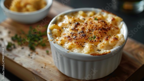 Luxuriously creamy baked macaroni and cheese, a Southern delicacy, showcased on an isolated backdrop, perfect for culinary ads, studio lighting