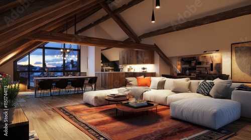 apartment, interior, design, luxury, attic, living, room, sofa, modern, decor, home, furniture, style, wooden, beam, cosy, elegant, comfortable, relaxing, window, view, sunset, city, landscape, night, evening, chic, stylish, rustic, warm, lighting, lamp, table, chair, rug, carpet, art, painting, kitchen, space, ambience