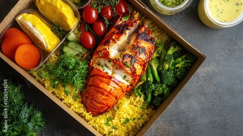 luxury, boxed, seafood, lobster, tail, rice, saffron, infused, vegetable, organic, epicure, elegant, upscale, fine, dining, take-out, premium, exclusive, meal, cookery, delicious, fresh, plated, bento, concept, cardboard box, refined, posh, dinner, lunch, indulgent, high-end, culinary, chef, presentation, savoury, exquisite, favor, colourful, stylish, modern, eatery, ready, fancy, nourishment, taste, portion, healthy, vibrant