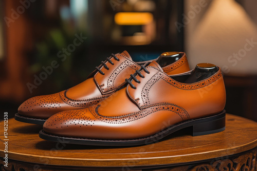 Luxury brown leather brogue shoes on wooden surface