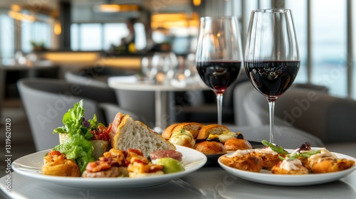 Luxury cruises comfort dining experience. Elegant dining with wine and gourmet dishes on a stylish table setting.