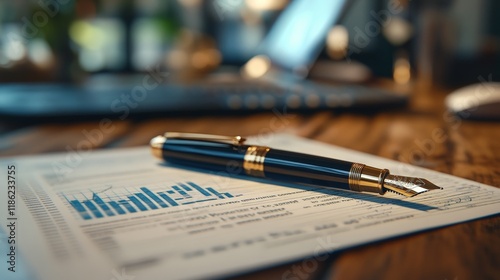 Luxury fountain pen on a financial report with blue charts. Ideal for business, finance, and professional themes.